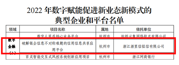 近日,浙江省發(fā)展改革委公布了2022年數(shù)字賦能促進(jìn)新業(yè)態(tài)新模式的典型企業(yè)和平臺名單,市金投集團參股公司天道金科下屬企業(yè)以“破解銀企信息不對稱難題的信用信息共享應(yīng)用平臺”成功入選。