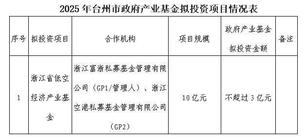 根據(jù)《臺州市政府產(chǎn)業(yè)基金管理辦法》(臺財(cái)企發(fā)〔2021〕6號)等有關(guān)規(guī)定,為充分發(fā)揮政府產(chǎn)業(yè)基金引領(lǐng)作用,臺州市政府產(chǎn)業(yè)基金擬組建非定向基金投向低空領(lǐng)域,已由臺州市金融投資集團(tuán)有限公司決策委員會(基金管理委員會)審議通過,現(xiàn)予以公示: